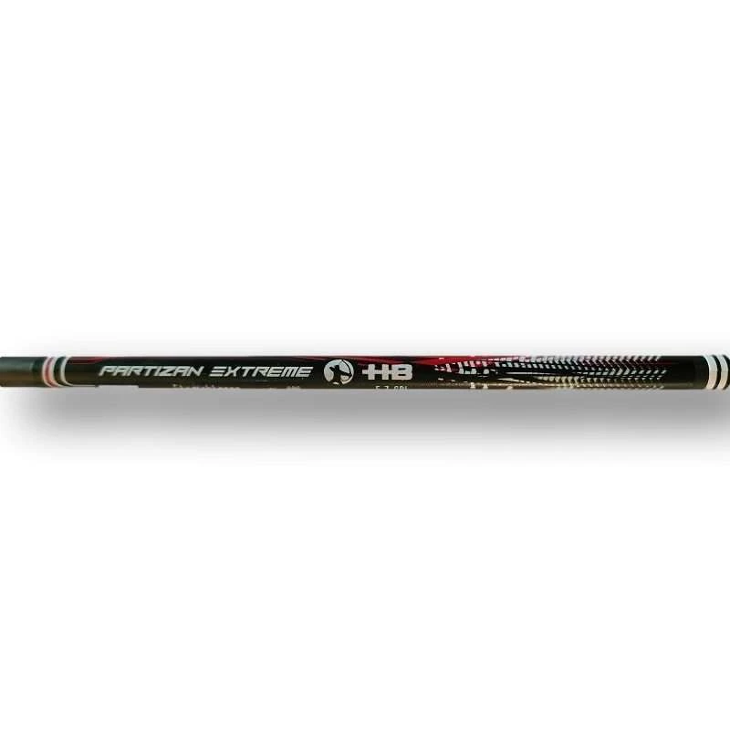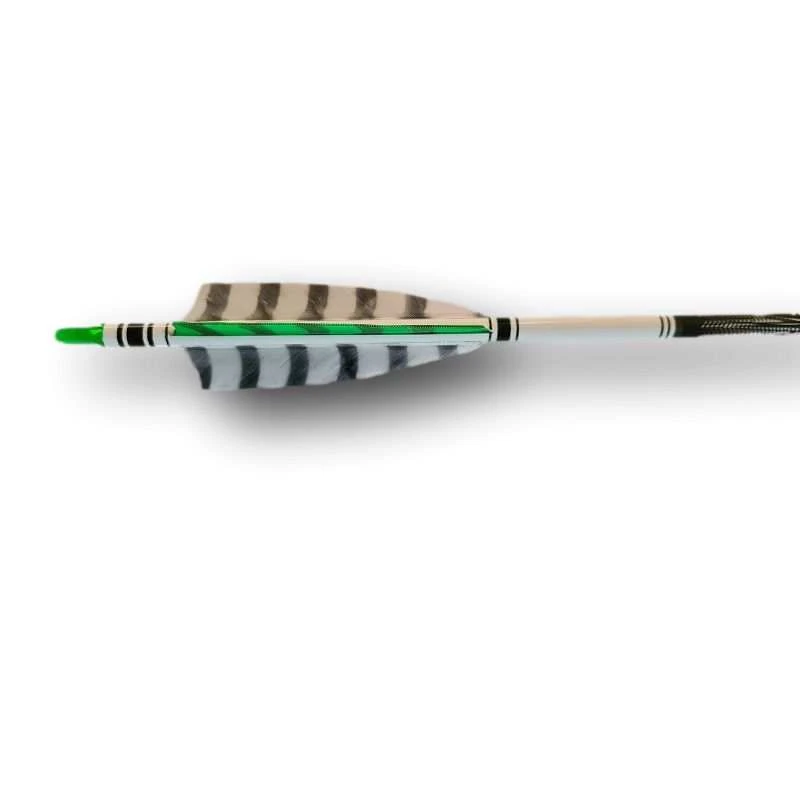 Les flèches carbone PARTIZAN EXTREME HB HENRY BODNIK en carbone tressée, Wrap traditionnel Bearpaw, enchoche « H », plumes tigrées 4″ shield Bearpaw en coq Vert et noir et en poule blanc et noir, insert en aluminium, insert en laiton en option.