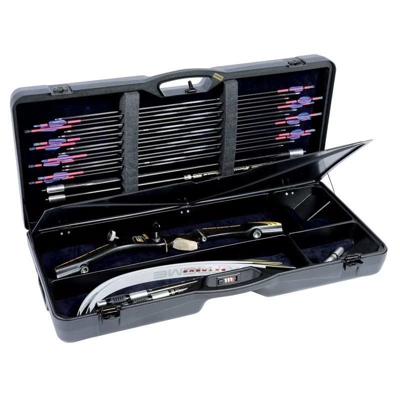 Équipé d’un panneau de séparation intermédiaire entre l’arc et les flèches, avec deux verrous latéraux en métal et une serrure à combinaison centrale en métal.